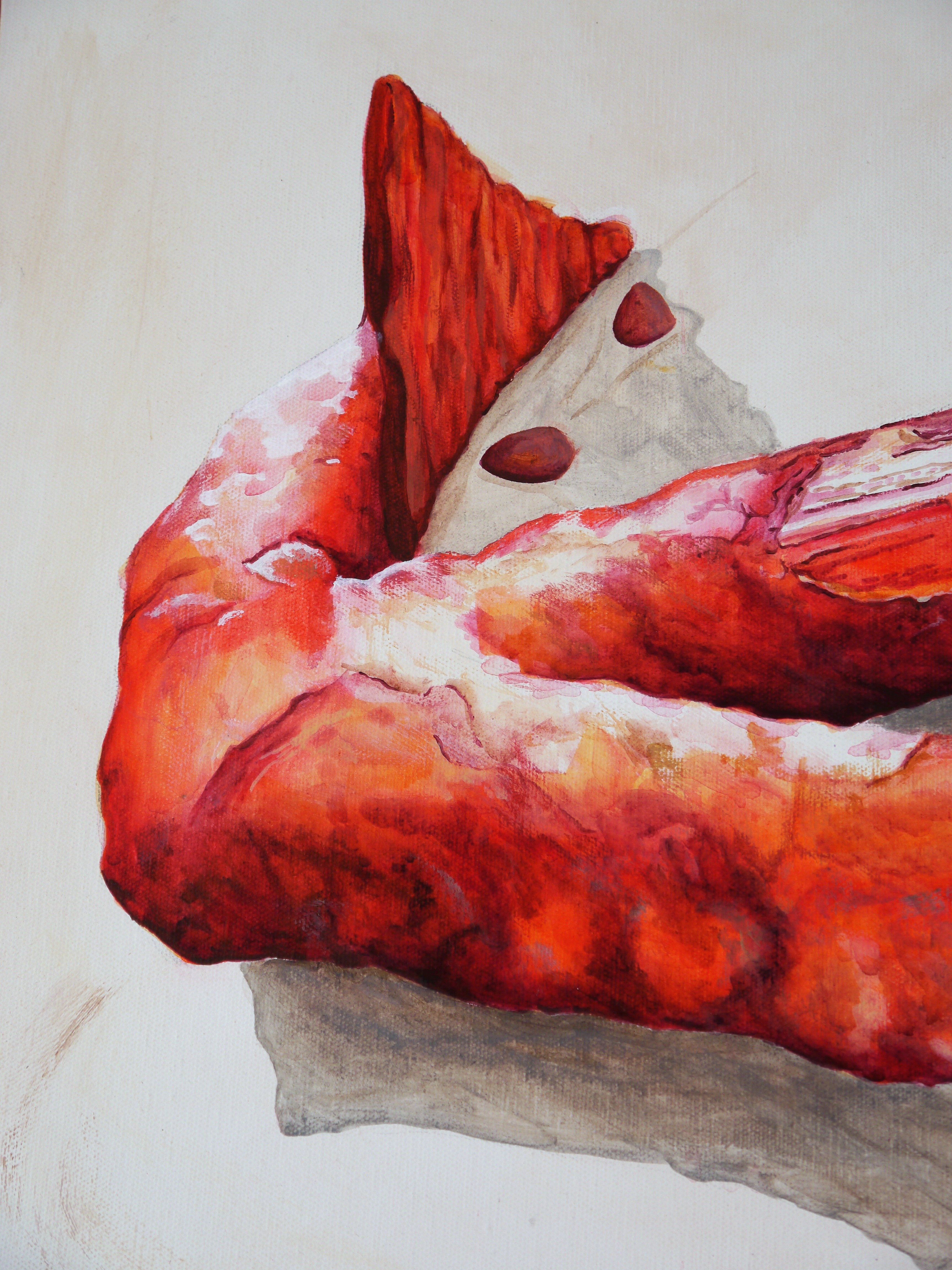 Working in acrylic, watercolour or gouache, I gradually build thin layers of paint. While this can be very time consuming, the results are detailed studies with tangible texture and translucent qualities.
